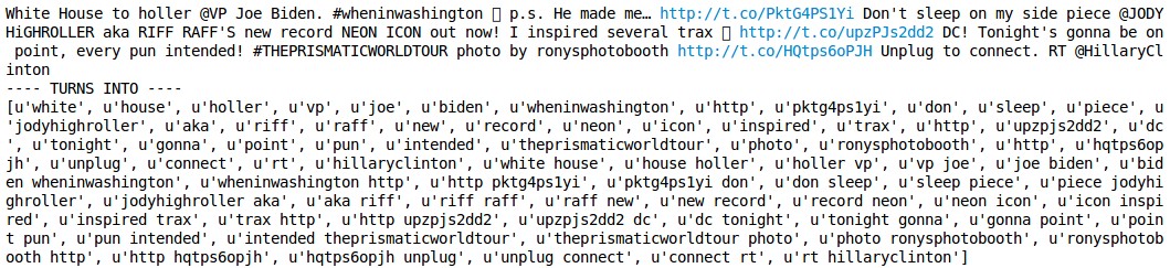 class looks through all tweets and takes note of all words (unigrams) and word bigrams (i.e. series of two words). It builds a dictionary out of all unigram/bigrams and essentially counts up how often every person uses each one. Here’s an example of some tweet text converted to unigram/bigrams:
