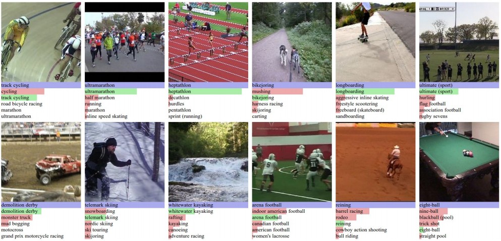 Spatio-Temporal CNN predicting Sports on videos. (Blue = ground truth, Green = correct prediction, Red = incorrect)