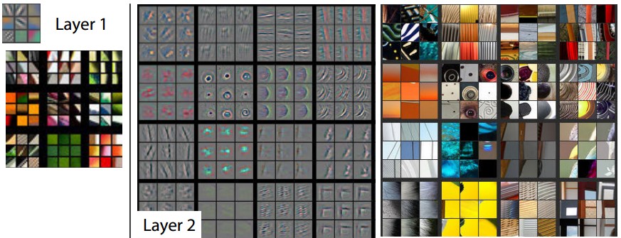 Learned CNN features. Visualization taken from a nice paper by Zeiler and Fergus 2013, Visualizing and Understanding Convolutional Networks". The features become more extended and complex deeper in the network.