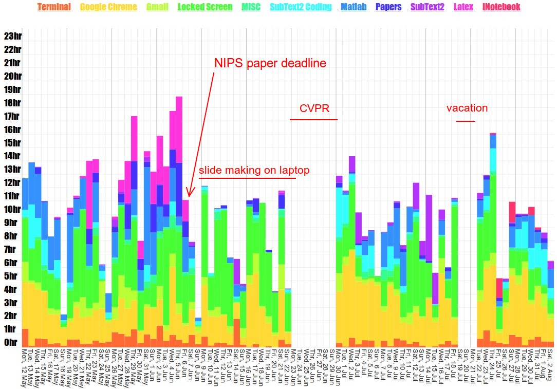 - Right after the deadline, you see a dip in activity. This is because I was mostly on my laptop preparing things for the CVPR conference where I had to give a talk. This points to one issue with ulogme - there is no syncing across machines right now.
