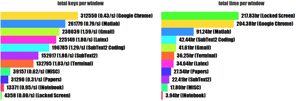 Next, ulogme gives me nice breakdown for both keystrokes and time spent in every window, across all time: