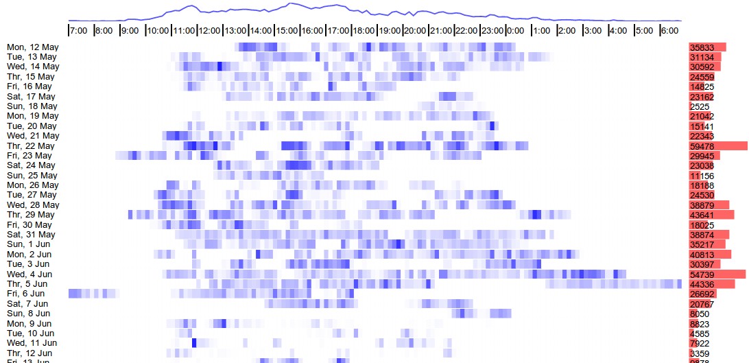 This visualization seems to suggest that I do most of my work between 10AM and 8PM, and a very productive day is about 50,000 keystrokes. You can also see a bit of my post-NIPS refactory period with much lower keystroke activity.