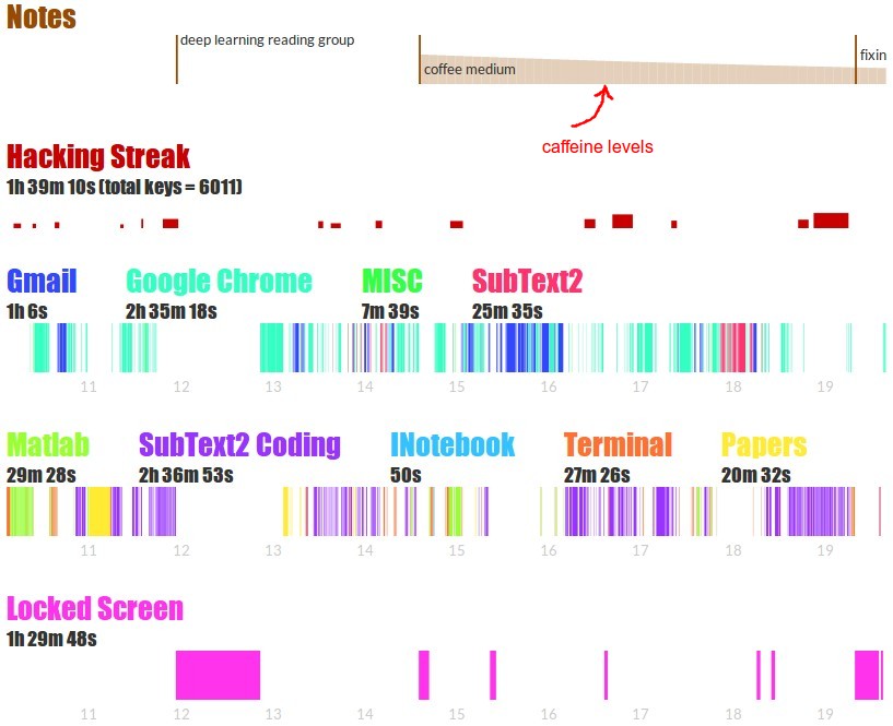 - When I toggle off all non-working titles, the visualizaiton (not shown) reveals that I only spend somewhat depressingly little time actually working. Many days I come into lab in the morning and leave late at night to go straight to sleep, but even these days sometimes add up to only roughly 5-6 hours of actual coding. I was very surprised about this initially and went looking for bugs, but it is true upon closer inspection - there is a short commute, lunch, dinner, random reading groups, meetings, random slacking off on the internet, gmail, etc etc… it all builds up quite quickly! Depressing to see that quantified.