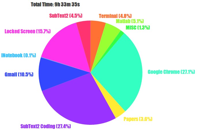 This is a little incomplete because I do some hacking on my laptop, but it paints an interesting picture nonetheless. It looks like I spent a good chunk of desktop time in Matlab, but seemingly I spend the most amount of time in Chrome screwing around and browsing the internet. Great.