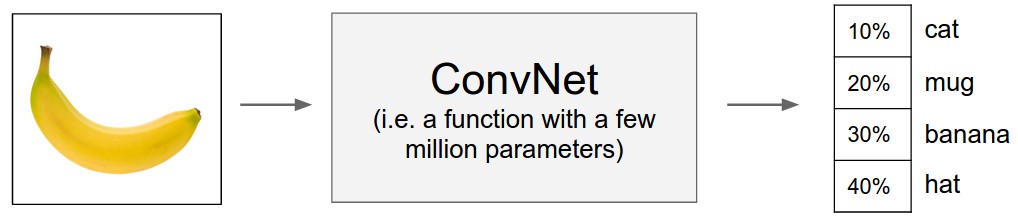 ConvNets express a differentiable function from the pixel values to class scores. For example, a ConvNet might take a 227x227 image and transforms these ~100,000 numbers through a wiggly function (parameterized by several million parameters) to 1000 numbers that we interpret as the confidences for 1000 classes (e.g. the classes of ImageNet).