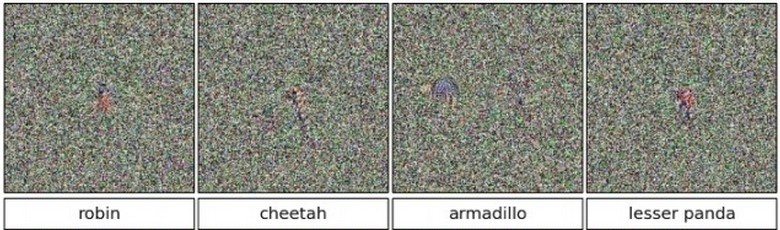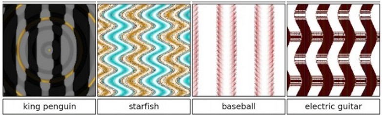 And a set of very closely related results was later followed by Deep Neural Networks are Easily Fooled: High Confidence Predictions for Unrecognizable Images by Nguyen et al. Instead of starting with correctly-classified images and fooling the ConvNet, they had many more examples of performing the same process starting from noise (and hence making the ConvNet confidently classify an incomprehensible noise pattern as some class), or evolving new funny-looking images that the ConvNet is slightly too certain about: