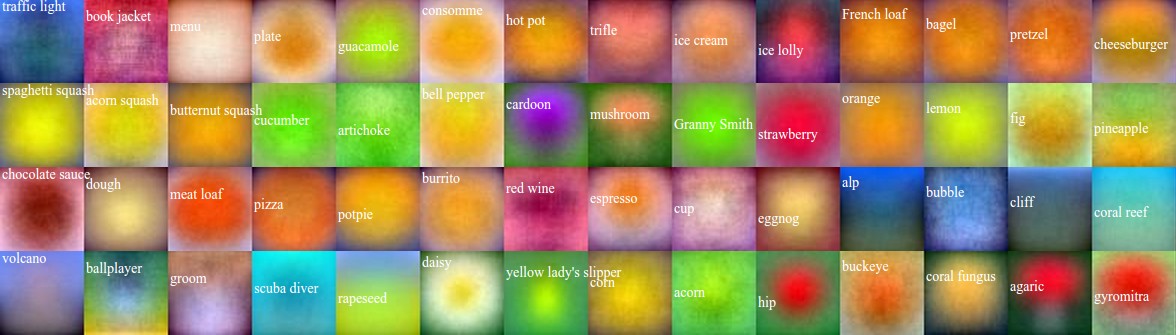 A linear classifier over image pixels implies that every class score is computed as a dot product between all the image pixels (stretched as a large column) and a learnable weight vector, one for each class. With input images of size 64x64x3 and 1000 ImageNet classes we therefore have 64x64x3x1000 = 12.3 million weights (beefy linear model!), and 1000 biases. Training these parameters on ImageNet with a K40 GPU takes only a few tens of minutes. We can then visualize each of the learned weights by reshaping them as images: